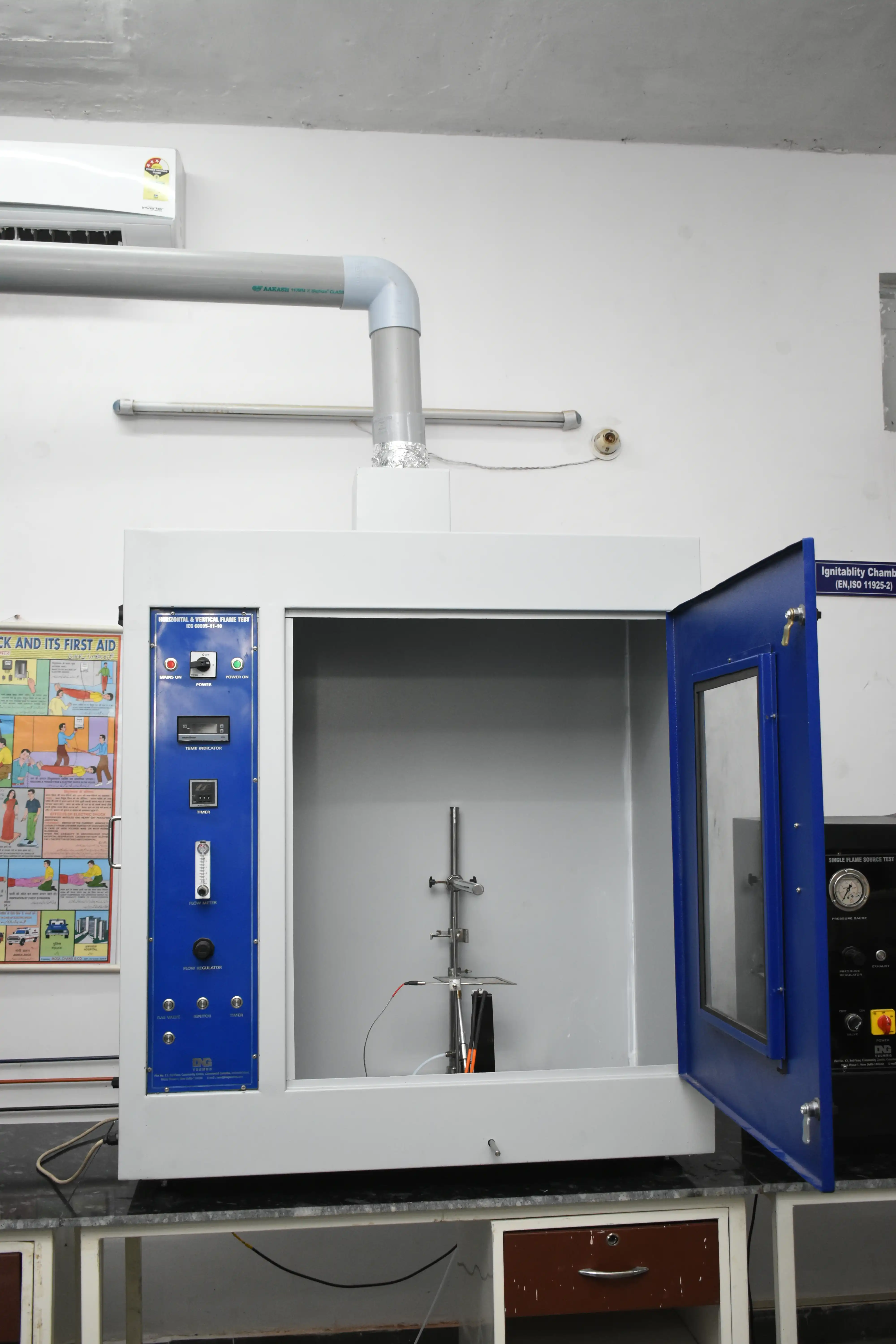 Engineered and manufactured by DNG Technologies – India’s leading fire testing equipment manufacturer, this UL 94 Flame Chamber ensures accurate, repeatable results for horizontal and vertical flame tests in compliance with international standards. Ideal for testing labs, R&D centers, and manufacturers of electrical, automotive, and construction materials, it delivers reliable plastic flammability testing for quality and safety certification.